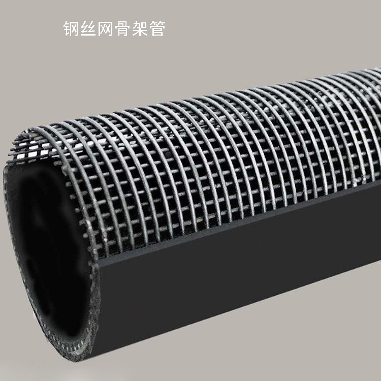 钢丝网骨架胶管结构钢丝网骨架管是钢丝网骨架塑料复合管的一个行业叫法简称,是一款改良过的新型的钢骨架塑料复合管。这种管材是用过塑后的高强度钢丝交叉纺织成网做骨架和热塑性塑料聚乙烯熔合而成,钢丝缠绕网作为聚乙烯塑料管的骨架增强体,以高密度聚乙烯(HDPE)为芯管基体,采用高性能的HDPE改性粘结树脂将钢丝骨架与内、外层高密度聚乙烯紧密地连接在一起,使之具有优良的复合效果。