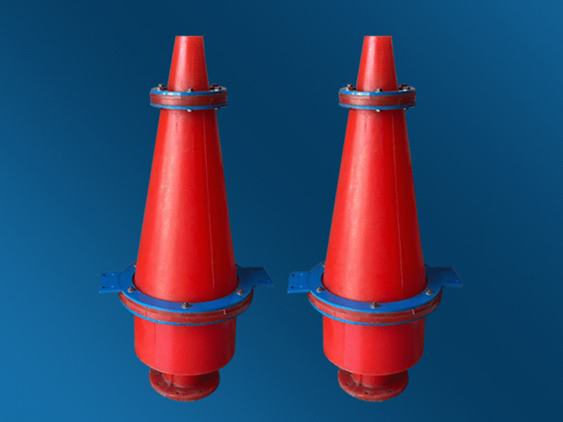结构:聚氨脂旋流器主体柱锥部分采用分段多角度设计,合理的柱锥段长度比例及溢流适配器的插入深度,有效的提高了旋流器的分级效率。这样,在某些原来需要使用大量小旋流器才能达到分离要求的应用场合,现在只需要使用数量很少的大旋流器就可以达到相同的效果。